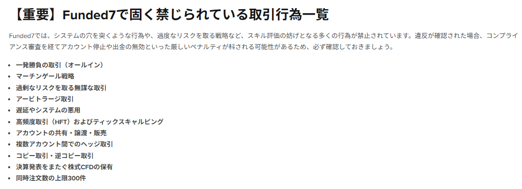 禁止事項に関しては、Funded7公式サイトの「Funded7のよくある質問のルール」よりご確認ください。